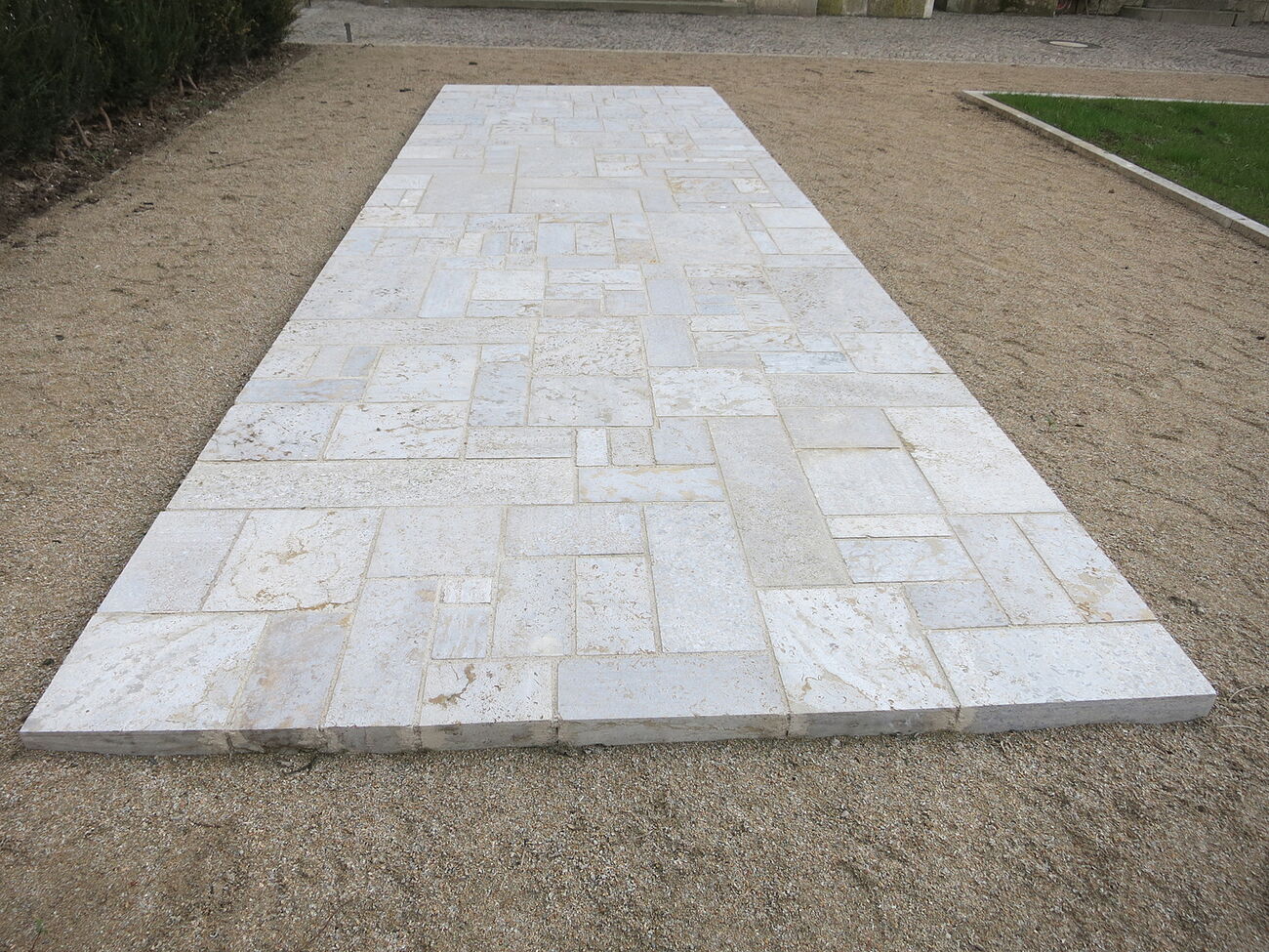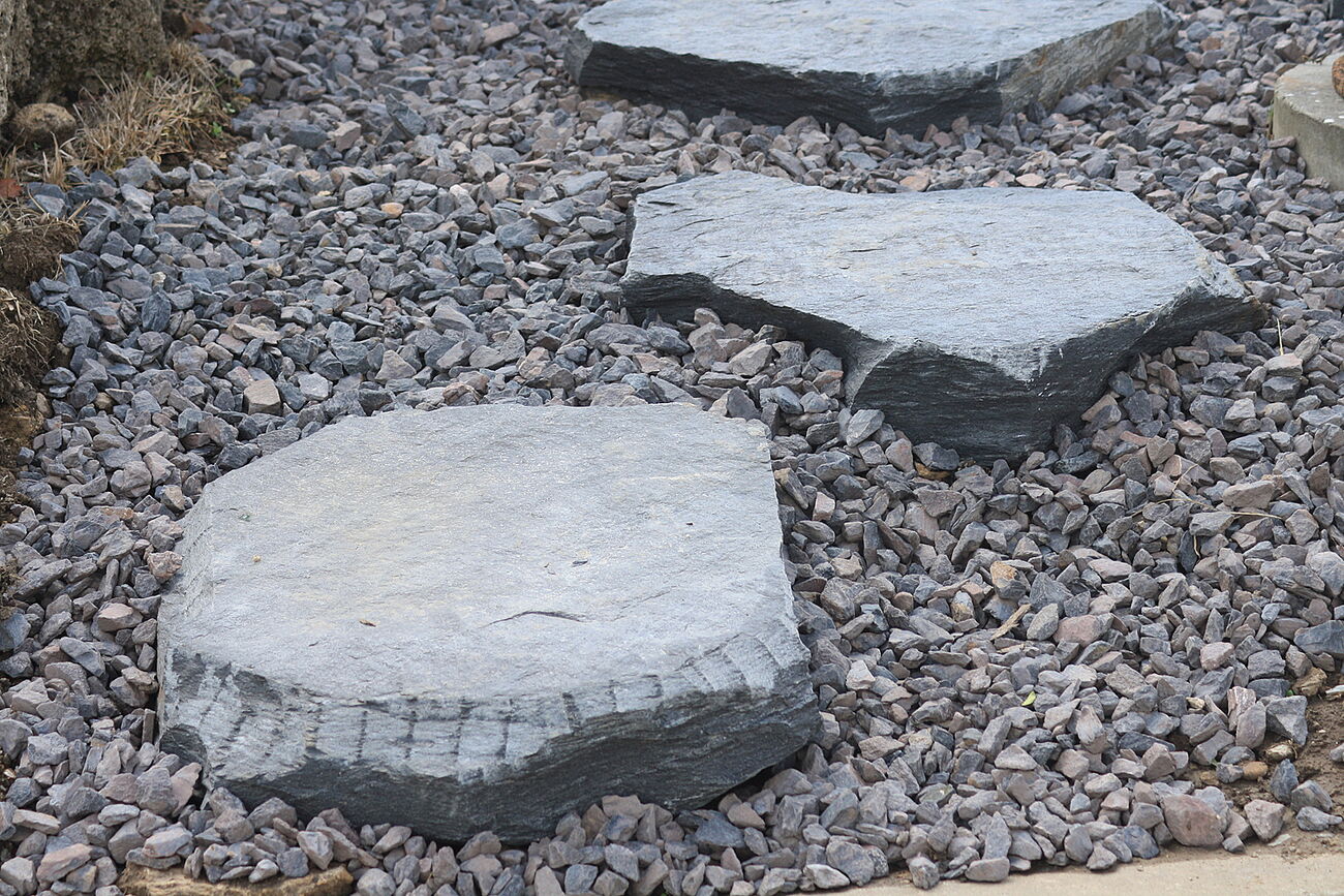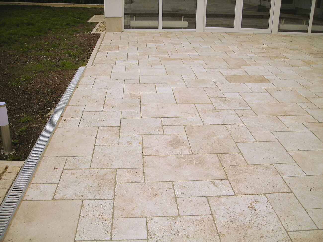 Zur Gestaltung von Terrassen, Wegen und Podesten können Polygonal- und Rechteckplatten verwendet werden. Die Oberflächen können zwischen gesägten, getrommelten, gestockten oder spaltrauhen Varianten ausgewählt werden. Travertinplatten werden als getrommelte Platten auch in Formaten für den römischen Verband angeboten. Polygonale Platten in unregelmäßigen Formen stehen in allen Materialien zur Verfügung und werden auch als Schrittplatten für Gartenwege verwendet.