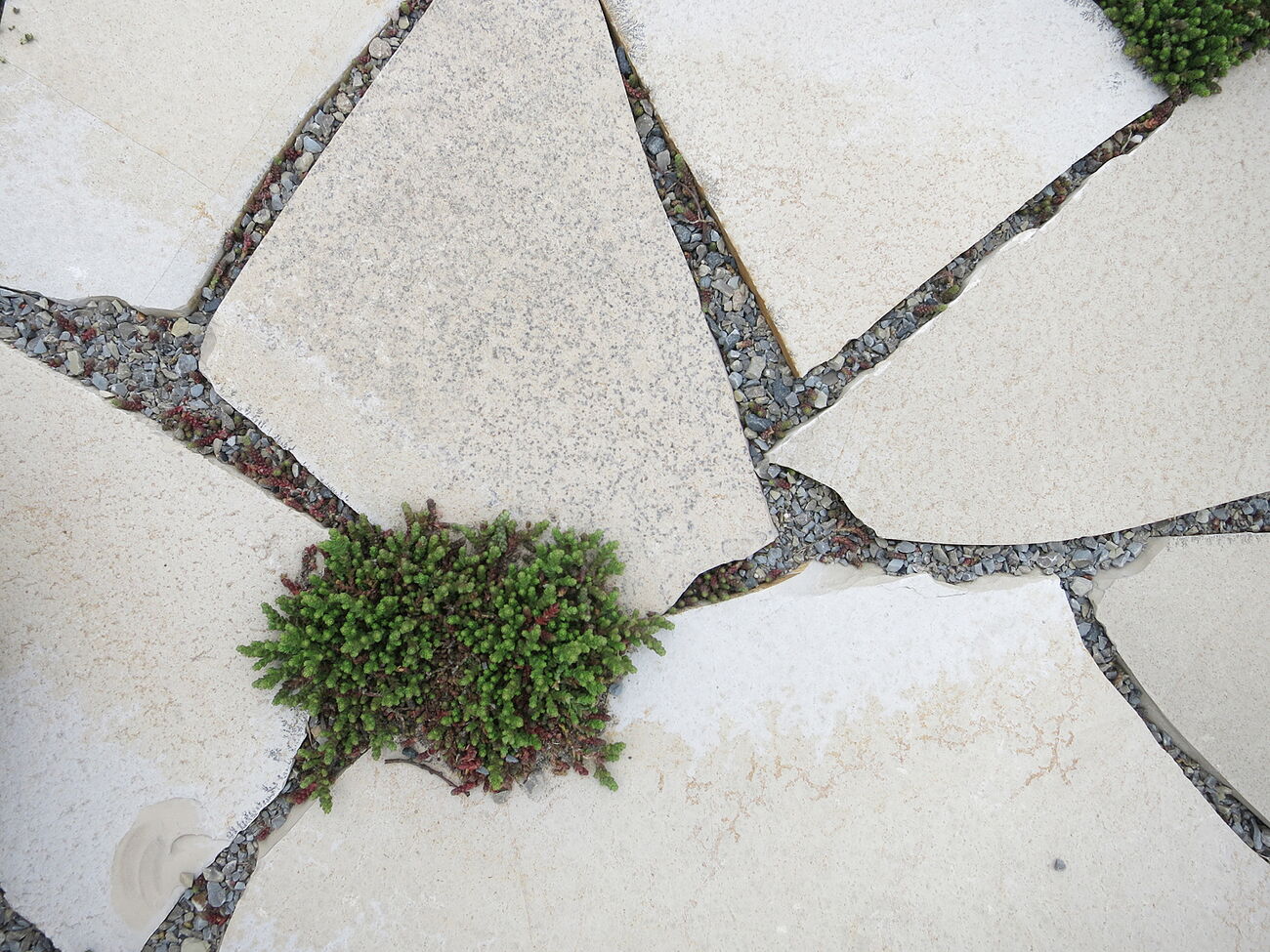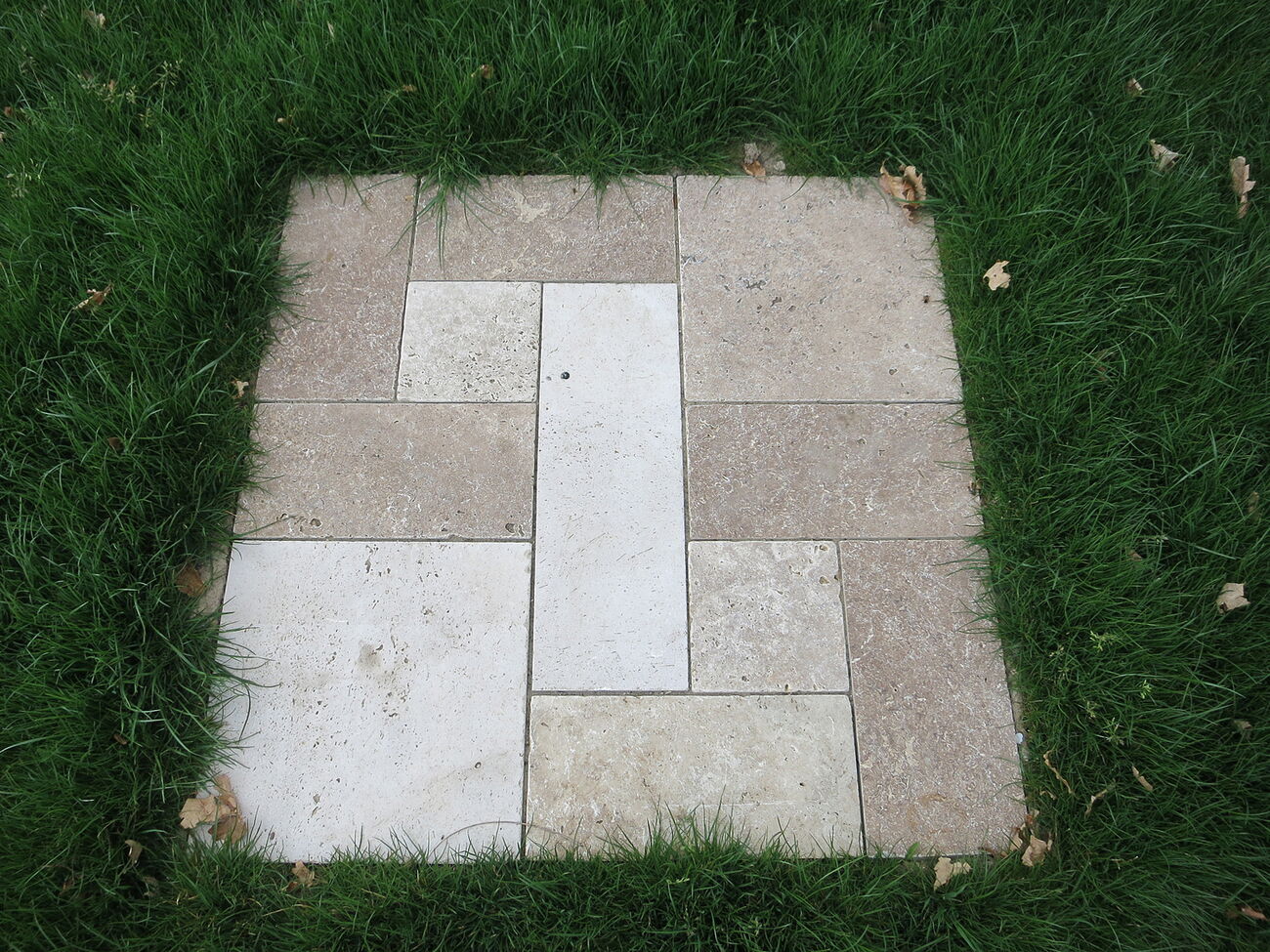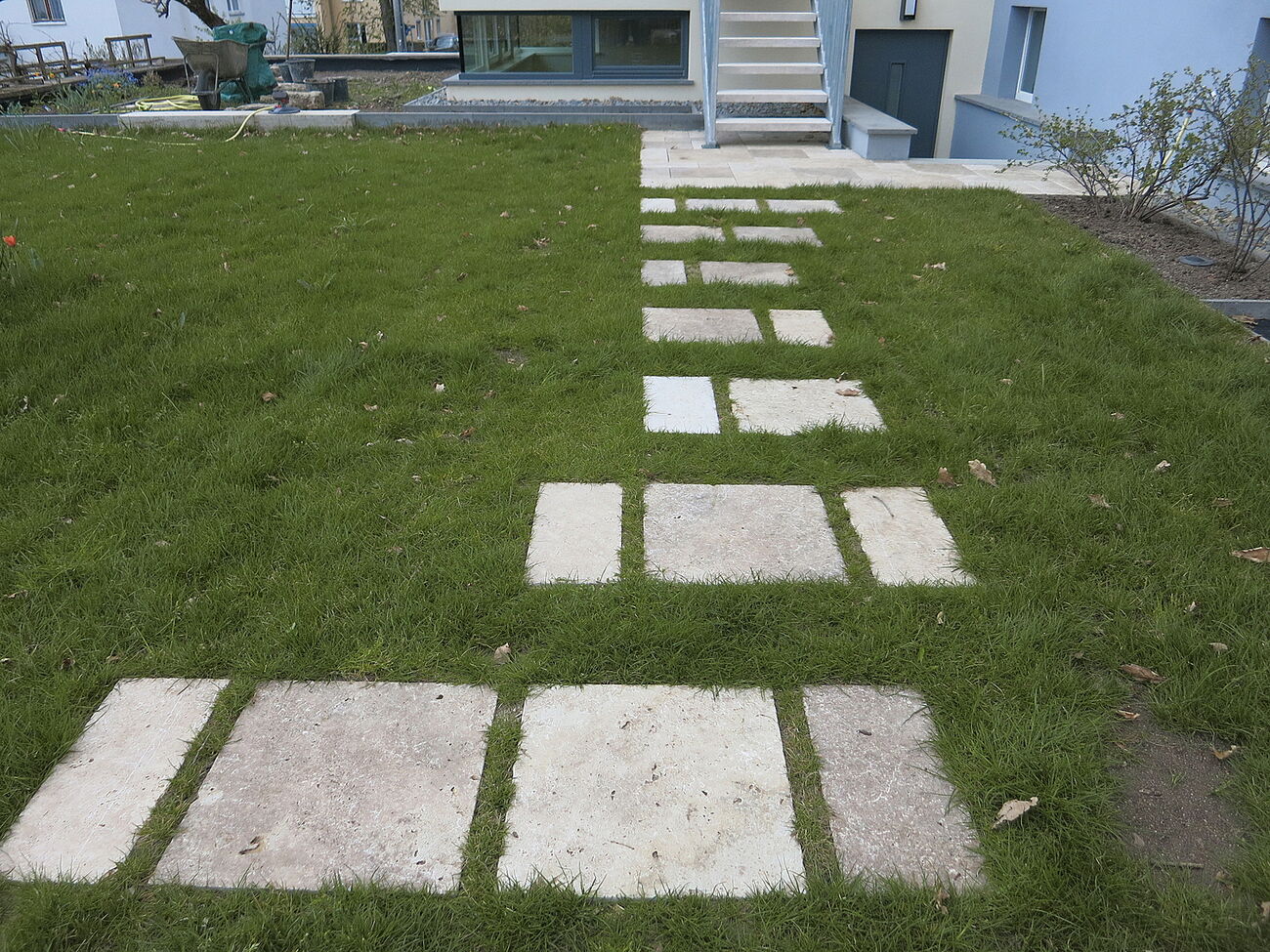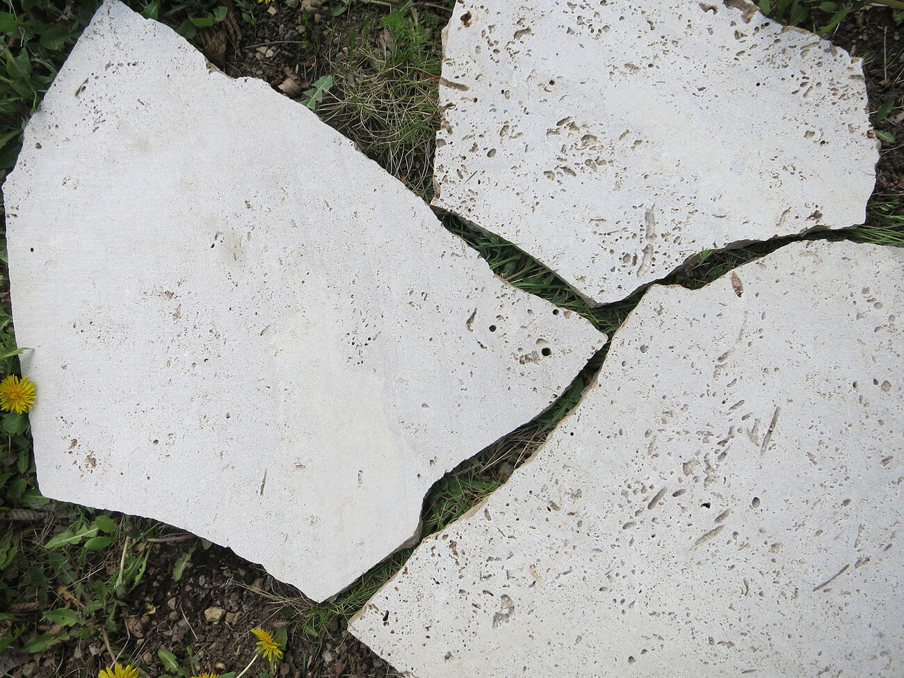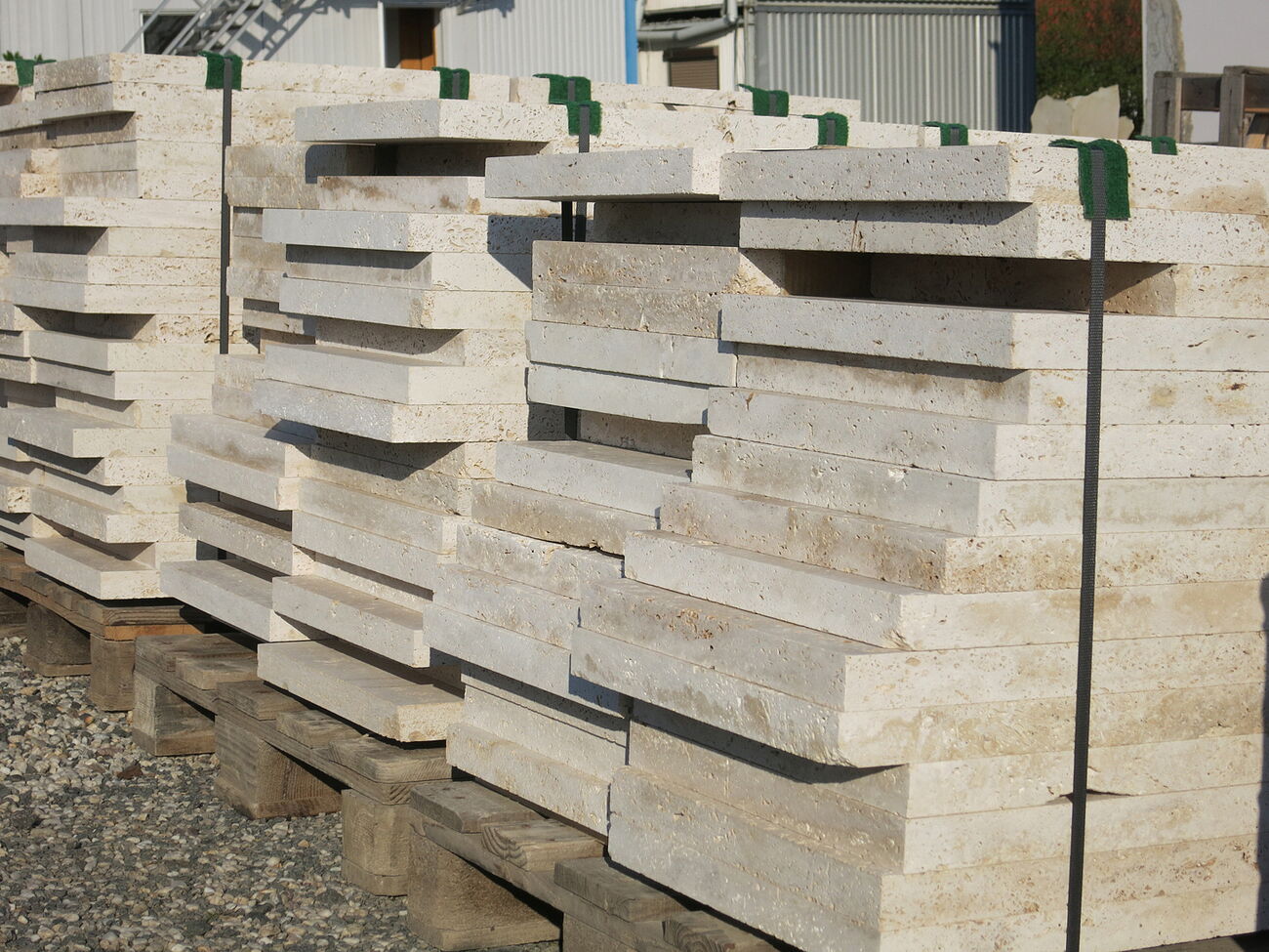 Zur Gestaltung von Terrassen, Wegen und Podesten können Polygonal- und Rechteckplatten verwendet werden. Die Oberflächen können zwischen gesägten, getrommelten, gestockten oder spaltrauhen Varianten ausgewählt werden. Travertinplatten werden als getrommelte Platten auch in Formaten für den römischen Verband angeboten. Polygonale Platten in unregelmäßigen Formen stehen in allen Materialien zur Verfügung und werden auch als Schrittplatten für Gartenwege verwendet.