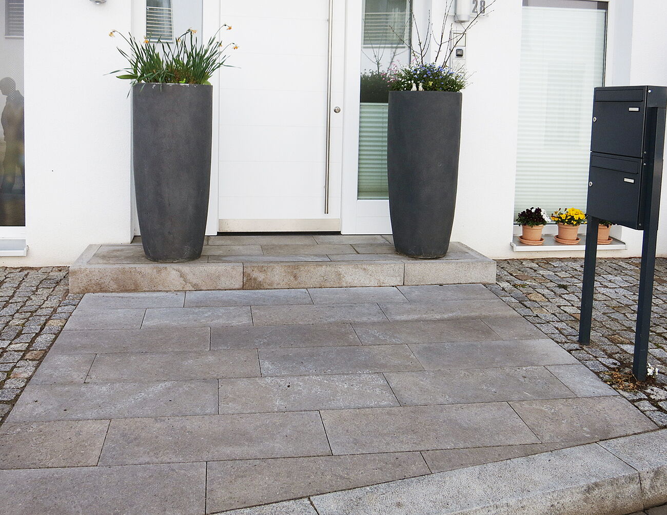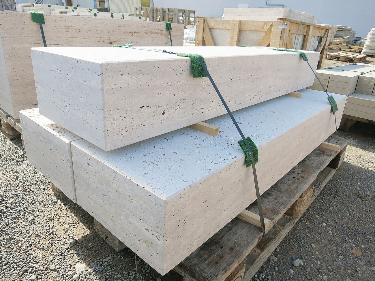 Standardgrößen wie L/B/H 100/35/15 cm sind in Travertin, Granit und Quarzit meist vorrätig.