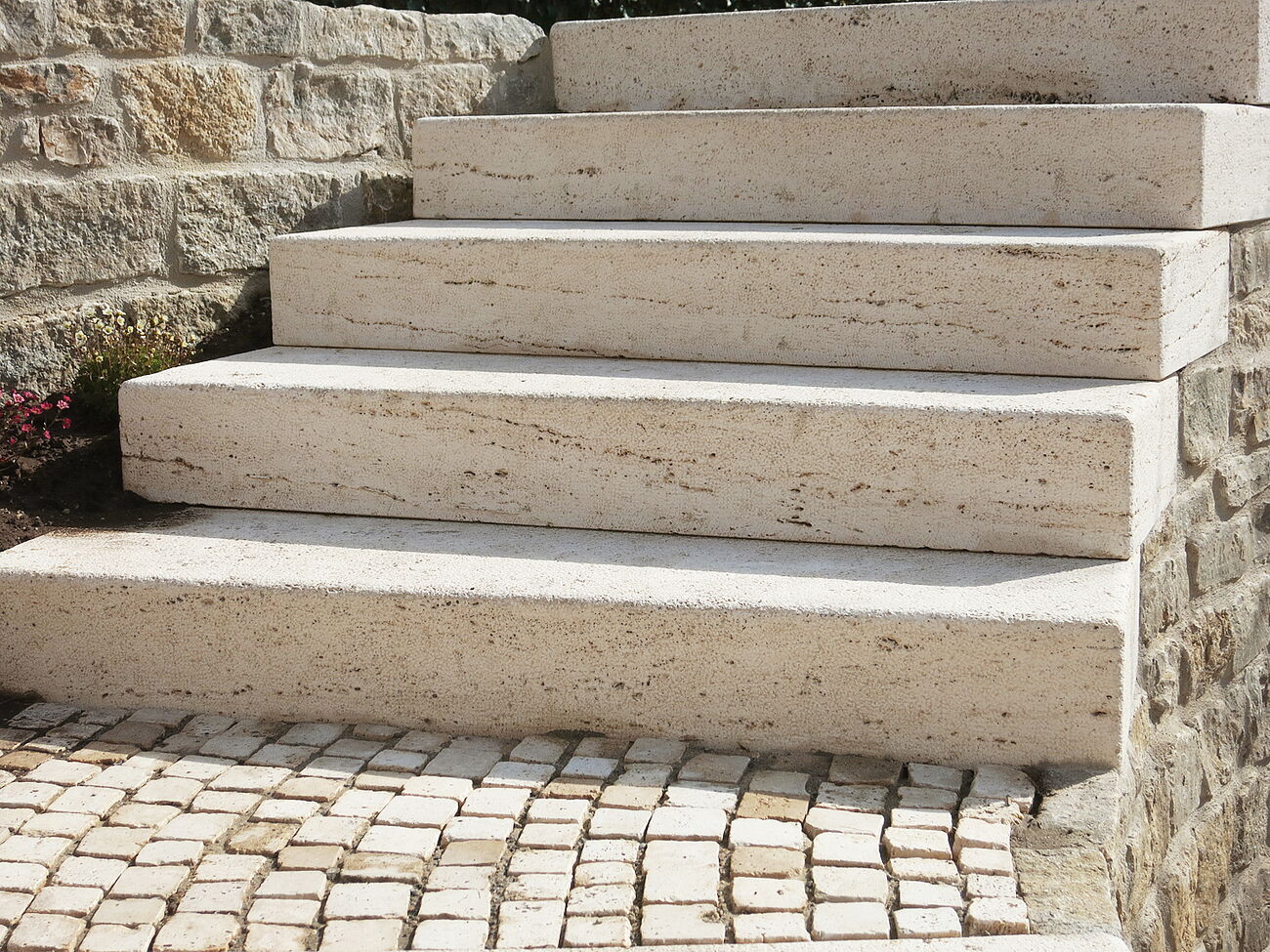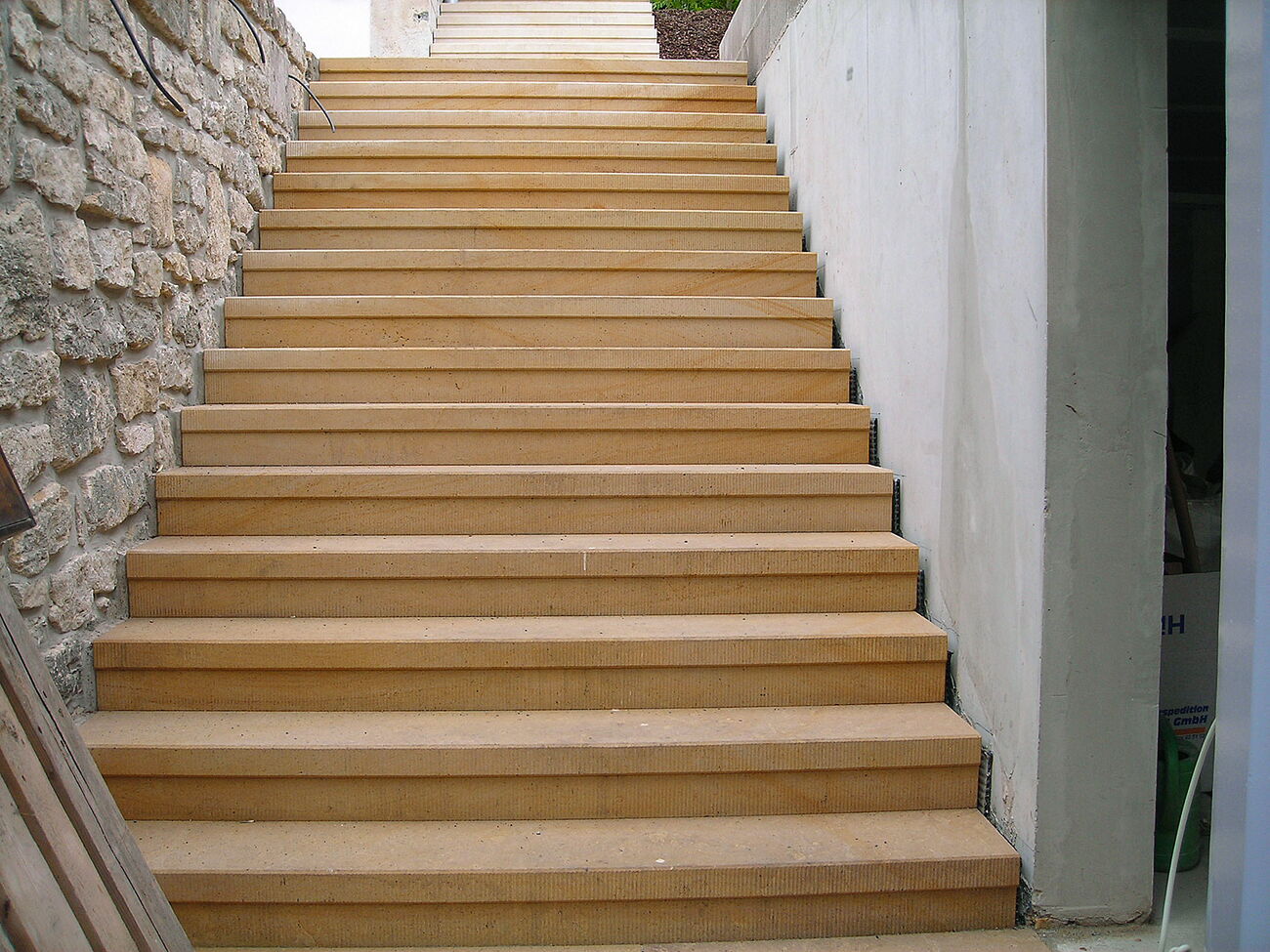 Treppenstufen können massiv als Blockstufen, Tritt- und Setzstufen oder Trittstufen ausgeführt werden. Zur Verwendung können die unter Materialien aufgeführten Natursteine kommen. Die Treppenanlagen werden nach Ihren Maßangaben und auf Wunsch mit entsprechenden Oberflächen und Profilierungen von unseren Steinmetzen gefertigt. Dabei sind gerade und radiale Treppenanlagen möglich.